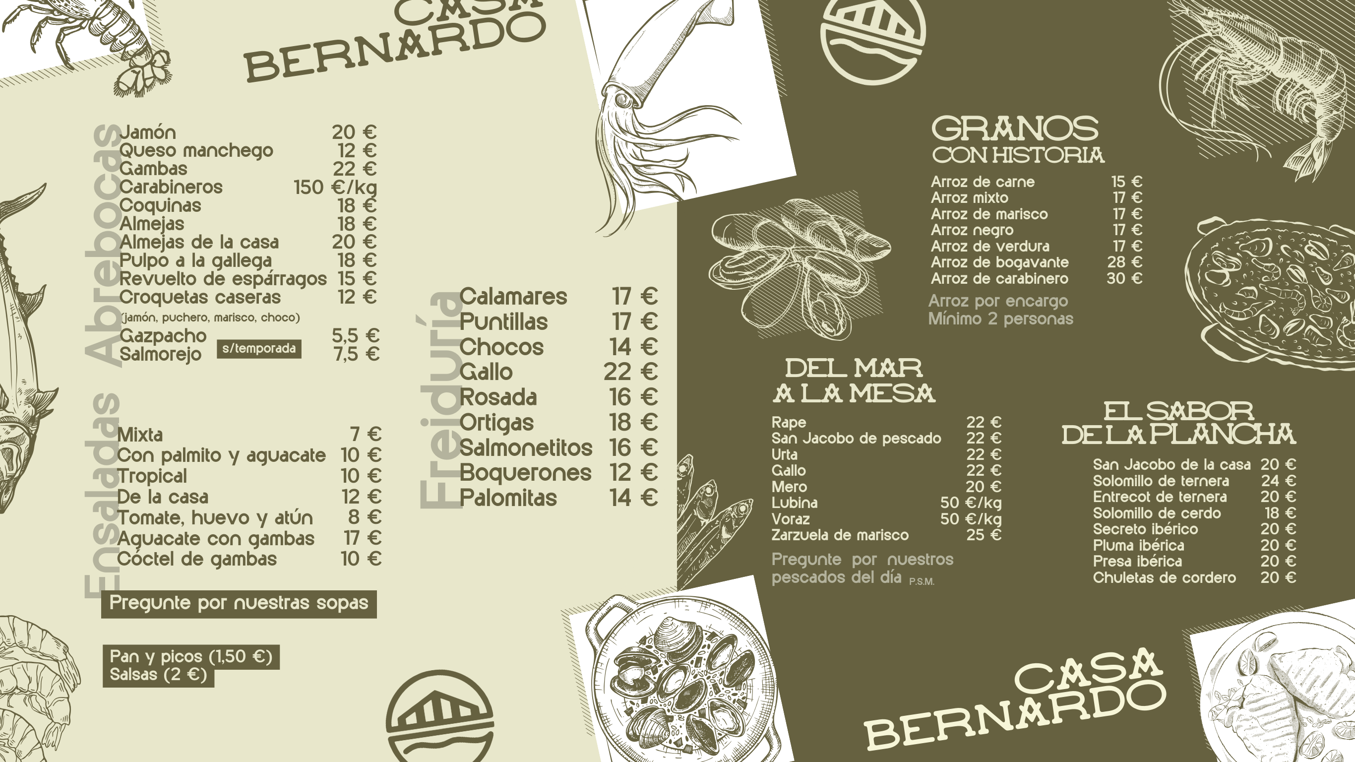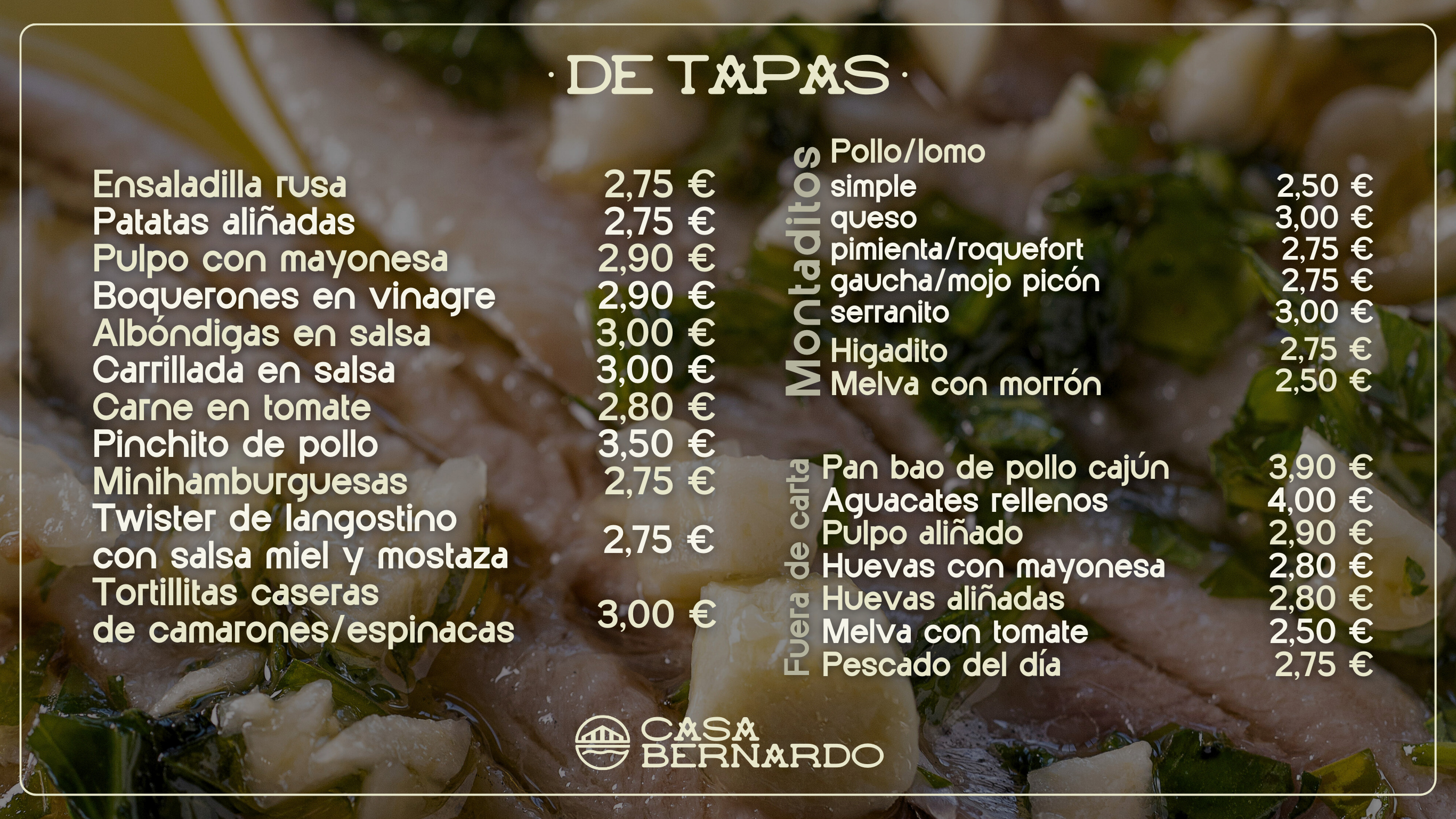 *Algunos platos pueden sufrir modificaciones en el precio por fluctuación del mercado. *Algunas tapas pueden no estar disponibles según cocina.